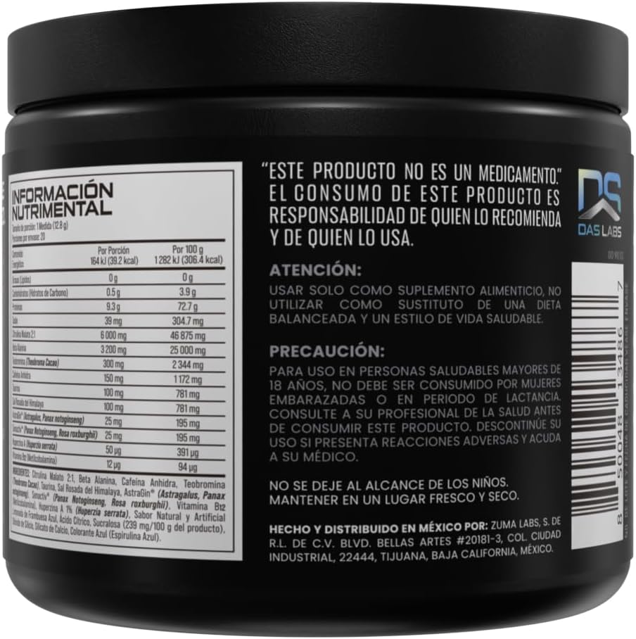 Suplemento en polvo en presentación de 20 servicios, diseñado como producto pre-entrenamiento con componentes nootrópicos y energizantes. Contiene cafeína, aminoácidos, extractos botánicos y otros compuestos de uso habitual en suplementos de esta categoría.