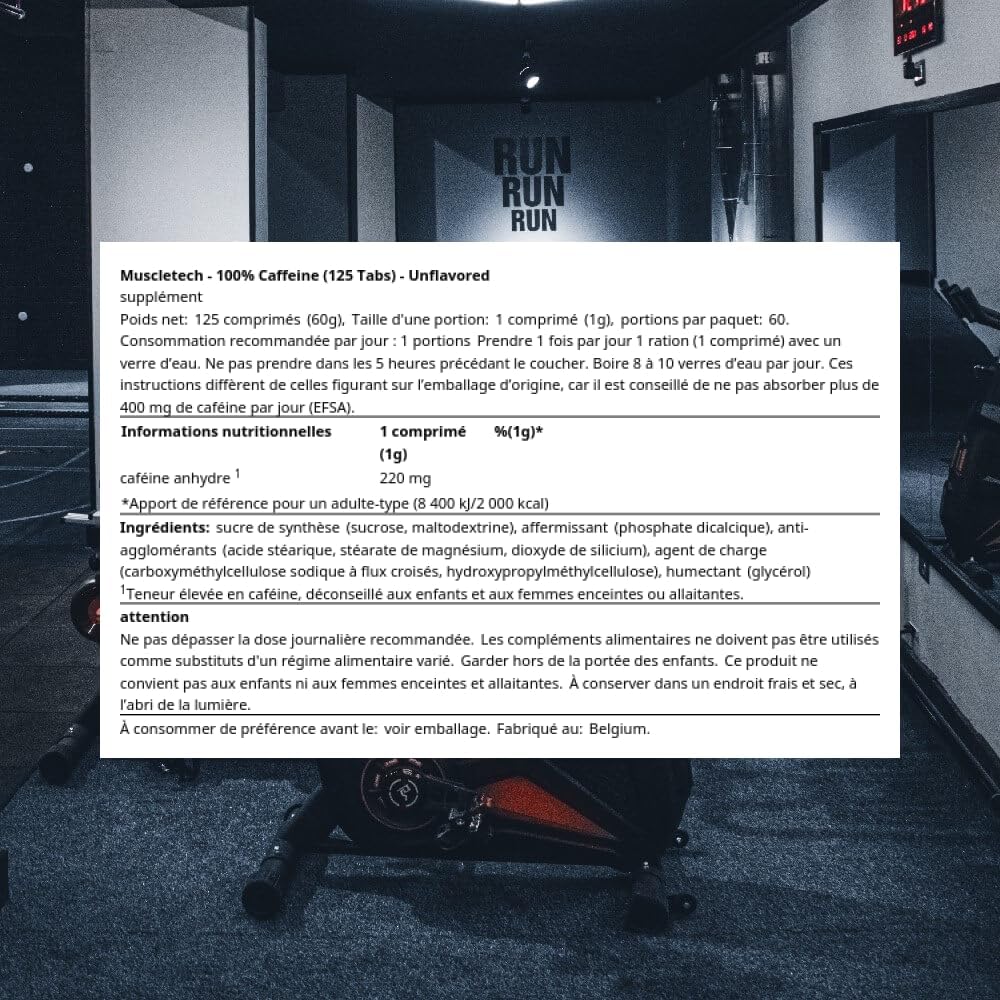 Platinum 100% Caffeine de MuscleTech es un suplemento dietético en tabletas que contiene cafeína anhidra en dosis precisa. Cada tableta ofrece 220 mg de cafeína, formulada para quienes buscan un aporte de energía claro, de uso controlado. Se presenta en envase con 125 tabletas, lo que permite varias dosis útiles para distintos momentos del día. Está diseñado para integrarse como complemento dietético, no como sustituto de una alimentación variada.