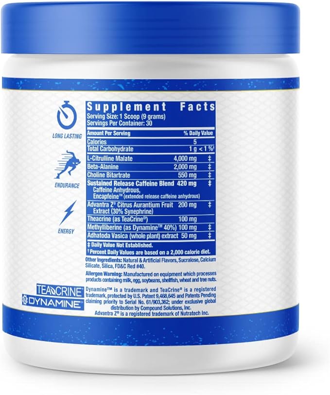 Incluye cafeína, beta-alanina y otros ingredientes habituales en pre-entrenamientos.